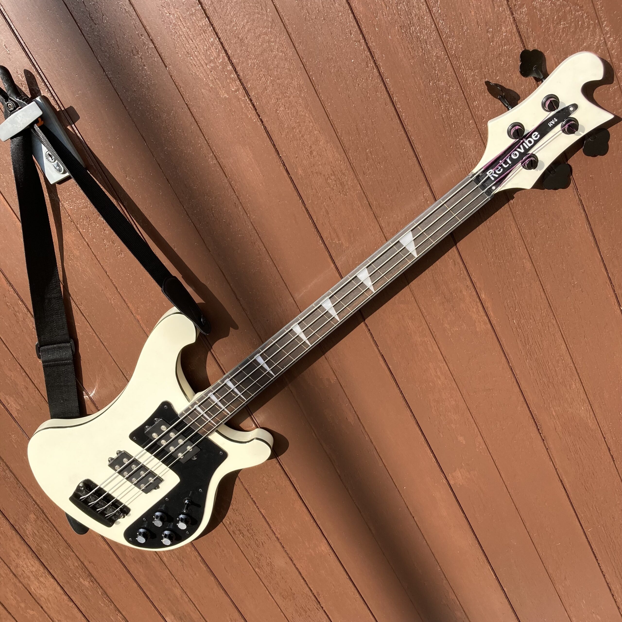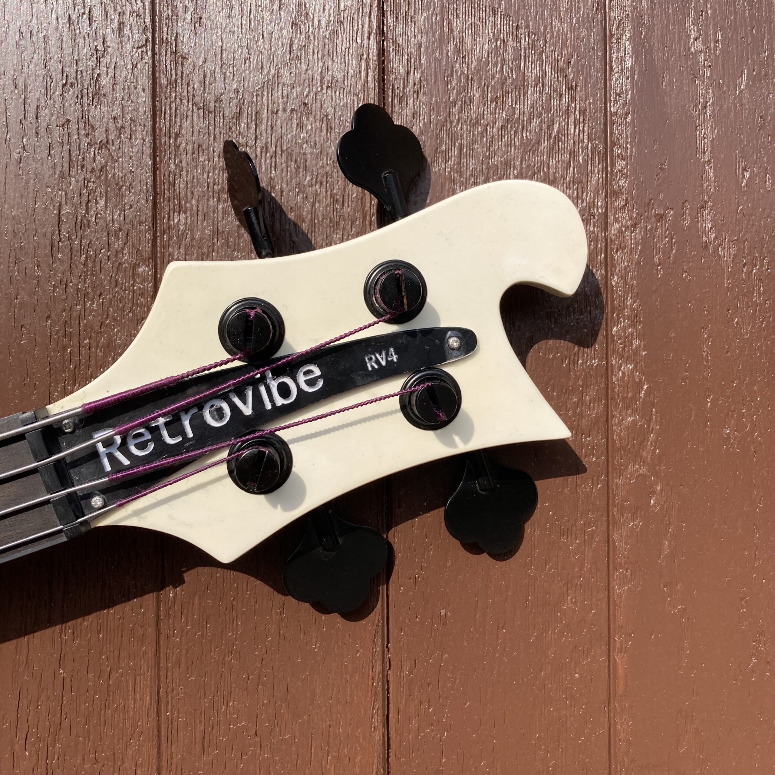 This one-off Retrovibe RV4 bass dates back to around 2012.It was originally fretted but arrived with too many frets damaged in transit. I immediately decided to make it into a unique fretless so I stripped the frets out and filled the slots with maple strips – then promptly tucked it away in a box and forgot about it. I rediscovered it recently when I moved my workshop and office and finally got round to completing the job!