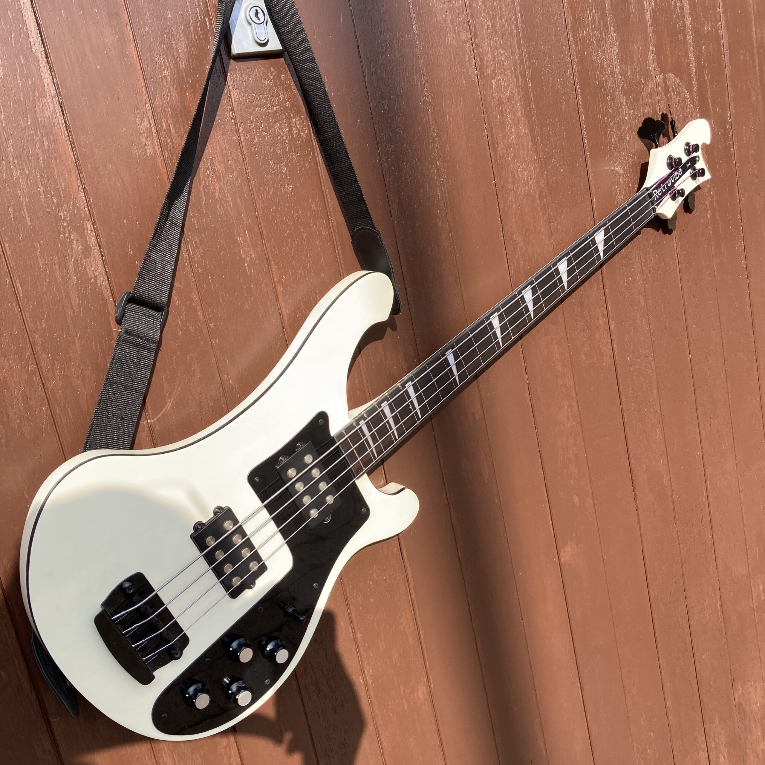 The set maple neck has a gloss finish and a rosewood fingerboard and the whole bass is now a gorgeous aged-white Tuxedo with appropriate black hardware.